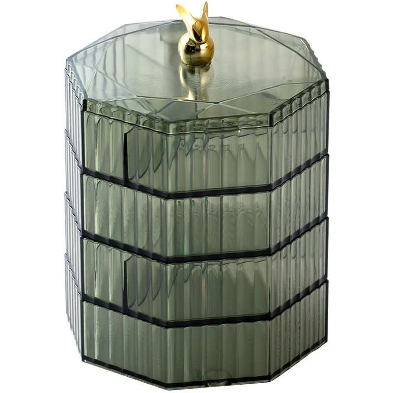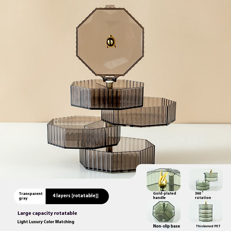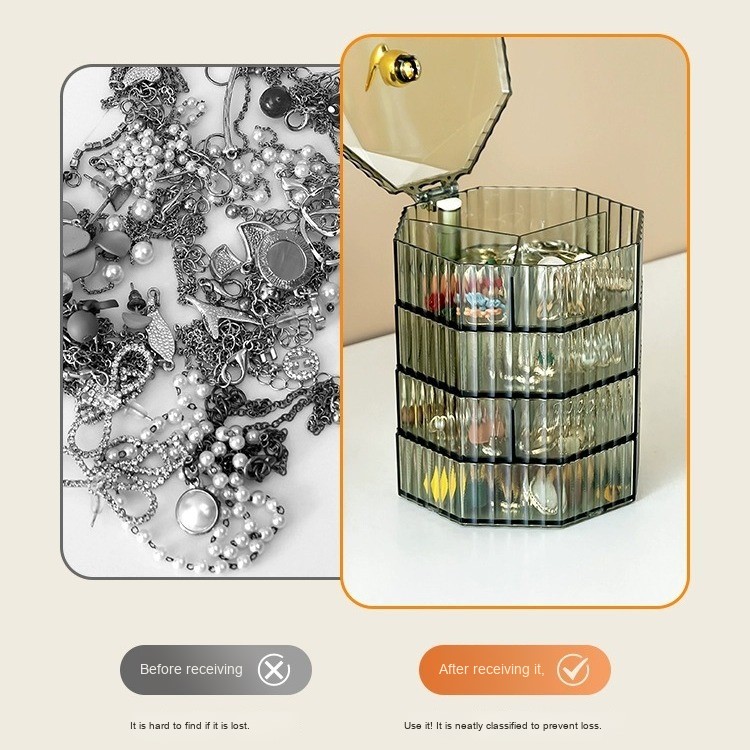 流畅的360度旋转机制让您轻松查看和挑选,无需拆卸单个托盘即可轻松取用每件饰品。半透明材质在保持可见性的同时,更增添了一丝低调的优雅,使其既是展示品,也是收纳解决方案。盒子轻巧而坚固,底座平衡,即使在满载的情况下也能稳定旋转,防止使用过程中意外倾倒。