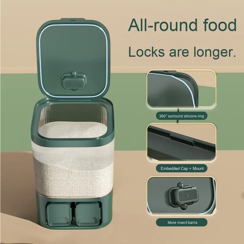 安全的锁扣装置确保始终如一的密封性能,加固的边缘可防止意外打开。平衡的底座设计确保放置在台面或食品储藏架上时保持稳定,符合人体工程学的轮廓即使在满负荷运转时也能舒适地操作。容量。除了储存大米,这款多功能储米箱还能有效容纳各种干货,例如面粉、谷物或宠物食品。